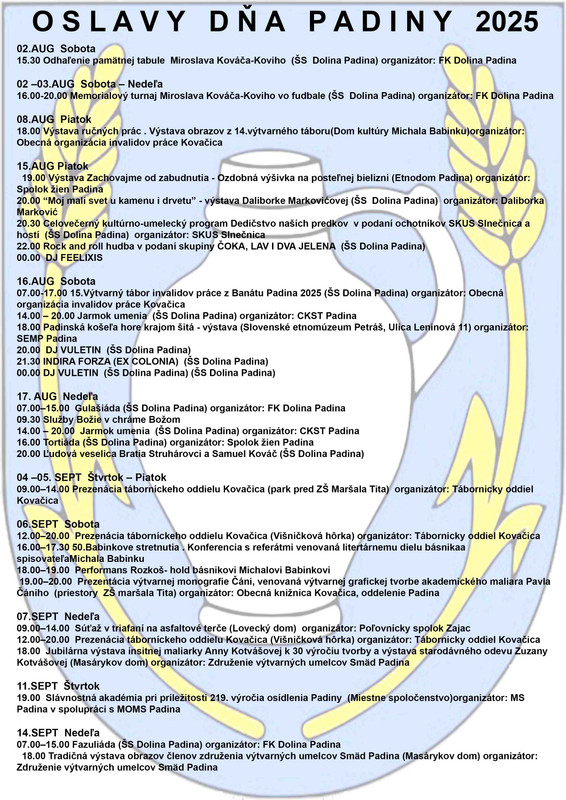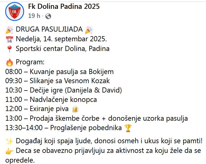 štvrtok 16.október 2025 - svoje meniny oslavuje Gál, Vladimíra streda 15.október 2025 - svoje meniny Terézia V nedeľu 26.októbra ráno , čiže zo soboty 25.októbra na nedeľu 26.októbra , prejdeme na zimné počítanie času a to tak , že sa ručičky na hodinkách v nedeľu ráno o tretej hodine vrátia o hodinu späť , teda na druhú hodinu . V rámci manifestácie kovačický október bude v nedeľu 19.októbra v Kovačici pasuljijada(kliknúť) . Predvečer v piatok 31. októbra a noc z 31. októbra na 1. novembra pred Sviatkom všetkých svätých je Halloween u nás známi aj ako noć veštica - americký sviatok, ktorý prichytili aj naší občania a zvlášť deti , keď sa najčastejšie vyrezávajú tekvice . V nedeľu 12.októbra 2025 v majstrovskom zápase v 1.juhobanátskej fudbalovej lige p.f.l. Pánčevo , fudbalový klub Dolina na svojom ihrisku v Padine uvítal ekypu Sloga Banatsko Novo Selo(kliknúť) . Zápas sa skončil bez gólov 0:0 . Všetky výsledky a tabuľku si môžete pozrieť na Srbijasport . Cirkevný sviatok "Kirvaj" sa v Padine bude oslavovať v nedeľu 2.novembra . Sankcije pre NIS(kliknúť) od 9.októbra začali vážiť . Na produkčnej burze(kliknúť) sa najviac predávala kukurica po 22,71 din/kg bez PDV-a . Cena pšenici nariasla za 0,92%, na 20,80 din/kg bez PDV-a , soja bola 51,00 din/kg bez PDV-a (56,10 din/kg z PDV-om) , slnečnica 55,40 din/kg bez PDV-a (60,93 din/kg z PDV-om) , uljana repica 51,71 din/kg bez PDV-a (56,88 din/kg z PDV-om) . Elektrodistribucija Srbska (EDS) oznámila, že používatelia, ktorý si samí očítajú struju , budú mať od októbrového račúna šesťpercentnú zľavu(popust)(kliknúť) na platenie za struju , ak račúm zaplatia do 20. dňa v mesiaci. Taktiež ak namiesto papierového račúna za struju sa rozhodnete aby ste dostávali iba elektronický račúm, tak budete mať ukupný popust 7%(kliknúť) . Cena zemiakov(kliknúť) v Evrópe skrze nadpriemernej úrode - klesne . Ošípané(kliknúť) sú lacnejšie , ale zato sú jahence dosť drakšie . V nedeľu 14.septembra bola druhá po rade "Pasuljijáda" čiže súťaženie o najlepší uvarený kotlíkový bôb v športovom stredisku Dolina v Padine a výsledky si môžete pozrieť na youtube1 , alebo youtube2(kliknúť) . V nedeľu 14.septembra bola v rámci osláv dňa Padiny tradičná výstava obrazov(kliknúť) členov združenia výtvarných umelcov Smäd Padina v Masárykovom dome a organizátor bolo združenie výtvarných umelcov Smäd Padina . Môžete si pozrieť aj kompletný program osláv dnja Padiny 2025(kliknúť) . Od 1.októbra zdrahne struja(kliknúť) 6,6 percentov . Taktiež červená zóna nebude od 1600, ale od 1200 kWh. Keď ninto struja tak občania môžu od 0-24h to prihlásiť do elektrovojvodiny v Pánčeve na tel.číslo 013319220 , alebo sa opýtať kedy príde struja. Oprávam-štelujem a preširujem dosah vášho internetu tj vašich wifi sieťov . Mám všetky druhy zachovaných ruterov pre internet , ako obyčajnie tak i repetítory , acces pointy , extendery a podobné . Pre bližšie informácie najlepšie napíšte SMS poruku v Padine na 0638606003 . Kto zomrel v Padine, môžete si pozrieť na facebooku pod menom "Dom Smútku Padina"(kliknúť). Mám na predaj všetky tipy polovnych punjačov pre hociktorý laptop . Tel. v Padine - napíšte sms poruku v Padine na 0638606003 . Brantner bude 2025.roku vynášať PET odpad čiže plastické fľaše v nasledovných dátumách ako na obrázku . V Padine na ulici Jána Čajaka 15 pracuje technická prehliadka (kliknúť) vozidiel Auto MBC . Pracovný čas im je pracovným dňom od pondelka do piatka od 7-15h . Technická prehliadka sa zakazuje vopred a to osobne, alebo na tel.číslo 013/668-200 . Čo Vám je potrebné pre technickú prehliadku môžete si pozrieť na obrázku1 , obrázku2 , obrázku3 , obrázku4 , obrázku5 . Výhľad budovy technickej prehliadky si môžete pozrieť na obrázku . utorok 14.október 2025 - svoje meniny oslavuje Boris pondelok 13.október 2025 - svoje meniny oslavuje Eduard, Edvin V nedeľu 12.októbra 2025 v majstrovskom zápase v 1.juhobanátskej fudbalovej lige p.f.l. Pánčevo , fudbalový klub Dolina na svojom ihrisku v Padine uvíta o 15:00 hodine ekypu Sloga Banatsko Novo Selo . V minulú nedeľu Dolina hrala na hosťovaní v Sefkeríne z domácou ekypou Tempo a výsledok bol nerozhodný 2:2 . Všetky výsledky a tabuľku si môžete pozrieť na Srbijasport . nedeľa 12.október 2025 - svoje meniny oslavuje Maximilián,Maxim sobota 11.október 2025 - svoje meniny oslavuje Zvonimír,Zvonimíra piatok 10.október 2025 - svoje meniny oslavuje Gedeón,Slavomíra štvrtok 9.október 2025 - svoje meniny oslavuje Silas, Anastázia streda 8.október 2025 - svoje meniny Eugénia, Una Od 6. do 12. októbra milicija bude trestať vozáčov ak používajú mobil(kliknúť) počas šoferovania a taktiež aj pešiakov ak sa zhovárajú kým prechádzajú cez pešiacky prechod alebo majú slušalice . V Debeljači v pondelok 29.septembra ráno bol zabitý človek na trhu , ako to píše Blic v texte1(kliknúť) a texte2(kliknúť) . utorok 7.október 2025 - svoje meniny oslavuje Eliška, Ela pondelok 6.október 2025 - svoje meniny oslavuje Viera, Patrícia Struju si môžete očitávať aj samí a zasielať stanje cez aplikáciu na mobilnom telefóne a budete dostávať račúm iba za ten mesiac , ináč popisiváči budú chodiť raz za tri mesiace a súhrn podelia pravidelne z číslom 3 tj na po jeden mesiac a taký mesačný račúm Vám bude aj stihávať . Môžete si pozrieť aj podrobný postup(kliknúť) čo sa všetko onedlho zmení , ale nie od od 1.júna ako čo bolo zahlásené , lebo sa tromesečnvo očitávanje brojila zateraz dočasne odkladá (kliknúť). Aplikáciu za prijavu strovenej struji si môžete najsť na Obchode Play(kliknúť) , a strovenú struju môžete prihlasovať aj cez počitač na webovej adre